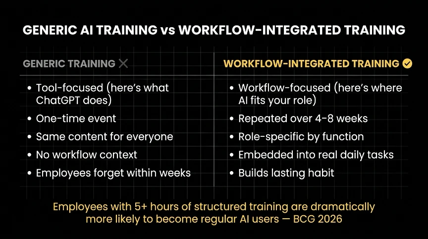 BCG's data makes this clear: employees with more than 5 hours of structured training are dramatically more likely to become regular AI users. Not because of what they learned in hour 5, but because repeated engagement builds the habit.