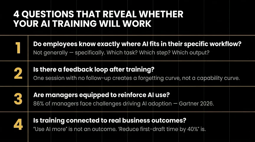 Not generally — specifically. Which task? Which step? Which output? If your team can't answer this with precision, the training didn't connect to their work.